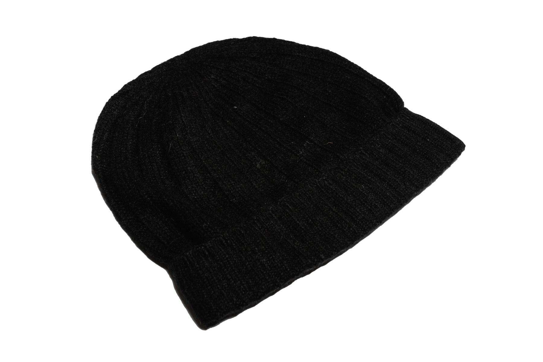 Black Mongolian cashmere ribbed beanie with soft texture and minimalist design, offering lightweight warmth and refined winter comfort.