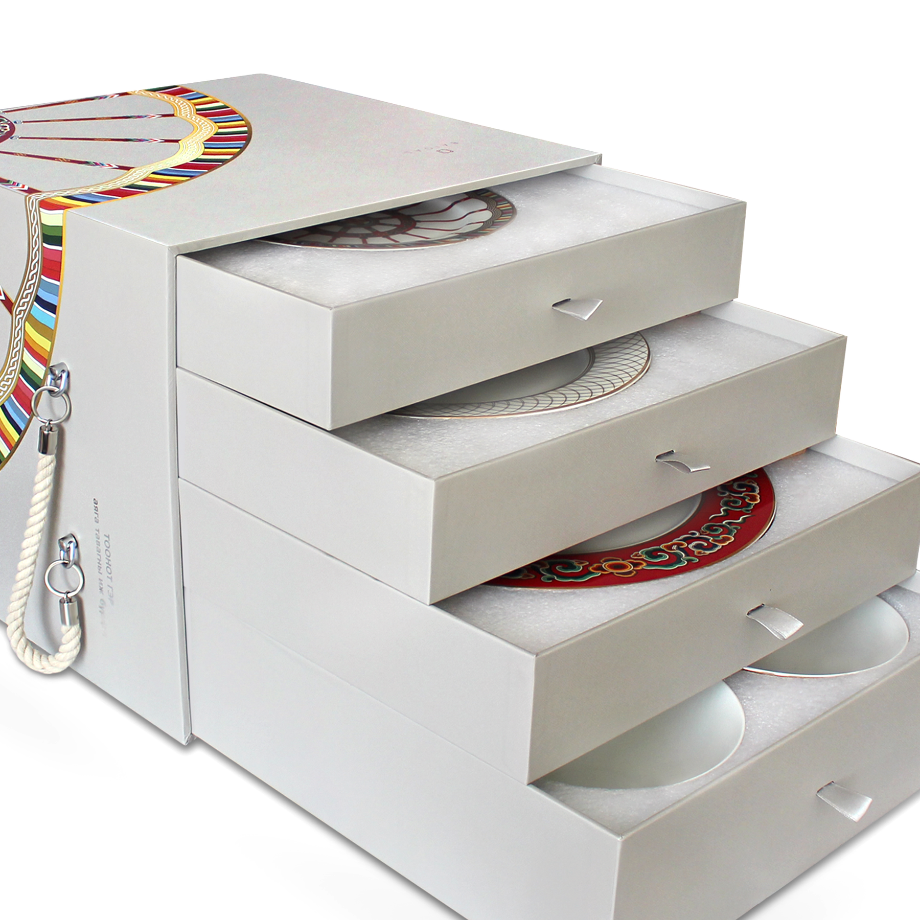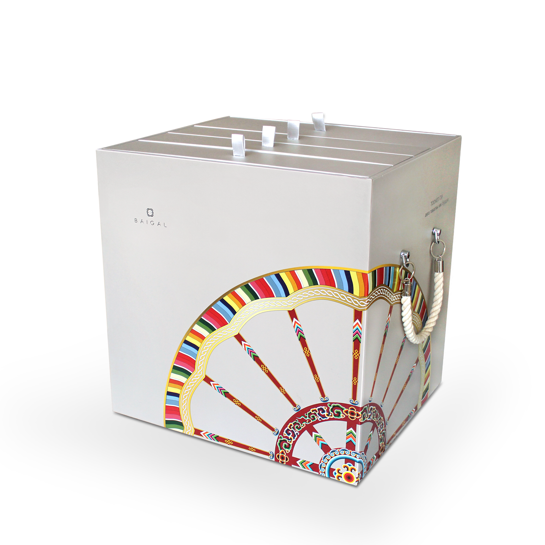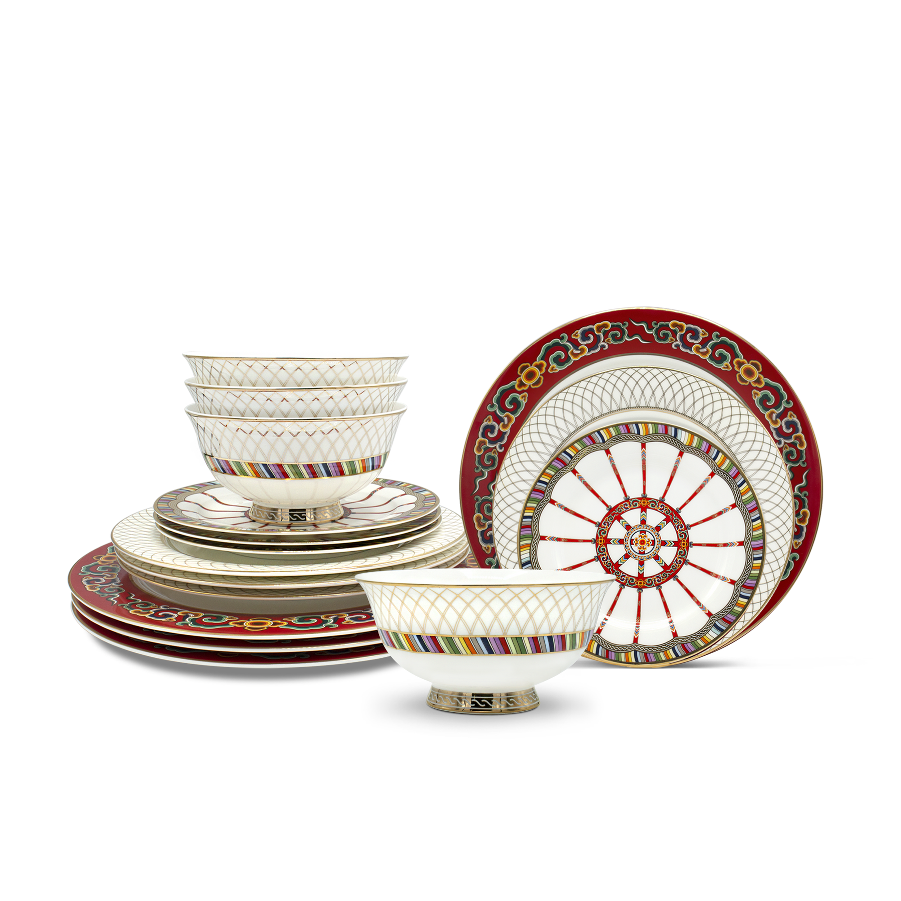 The TOONOT GER 16-piece dinnerware set for four is a canvas for the iconic 'toono' crown-ring roof, the 'uni' roof poles and the golden imagery of the iconic "khana" lattice wall, symbols of the traditional Mongolian ger's architectural brilliance.